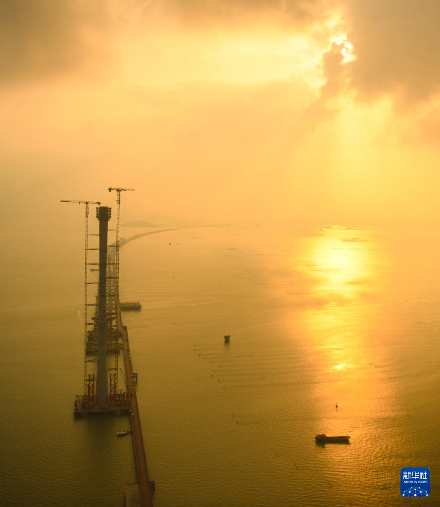 4月17日拍摄的夕阳下的黄茅海跨海通道黄茅海大桥西塔。