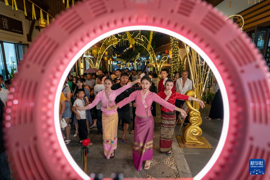 华灯初上,位于云南省德宏傣族景颇族自治州芒市的傣族古镇逐渐热闹起来。作为2022年国家文化和旅游部确定的第二批国家级夜间文化和旅游消费集聚区之一,这里极具特色的少数民族建筑、服饰、舞蹈、美食吸引着人们流连忘返。