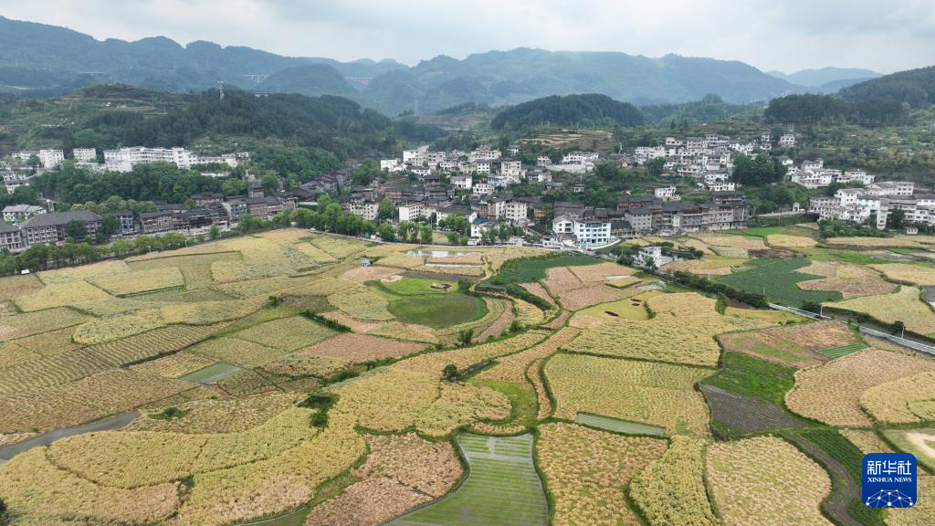 5月6日,在重庆市秀山土家族苗族自治县洪安镇美其村,村民在田间行走(无人机照片)。