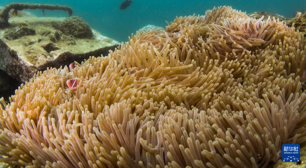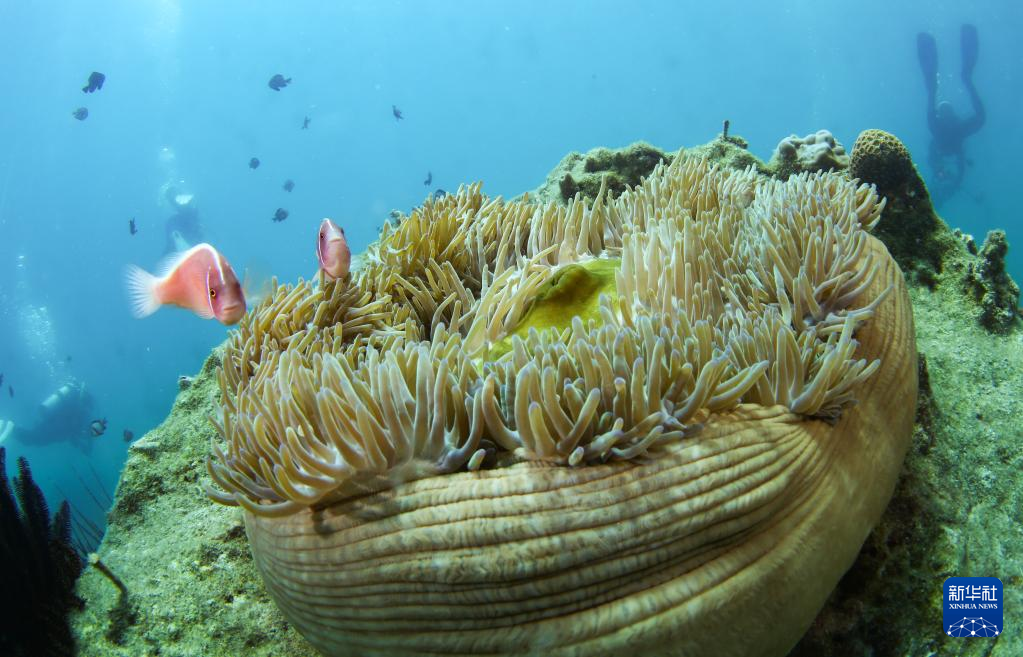这是在蜈支洲岛海域海洋牧场拍摄的小丑鱼和海葵(2021年5月22日摄)。
