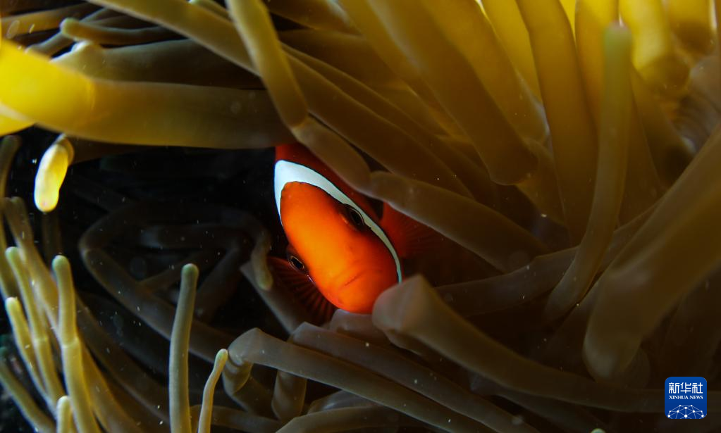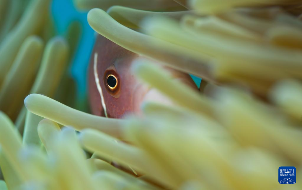 这是在蜈支洲岛海域海洋牧场拍摄的藏在海葵中的小丑鱼(2021年5月23日摄)。