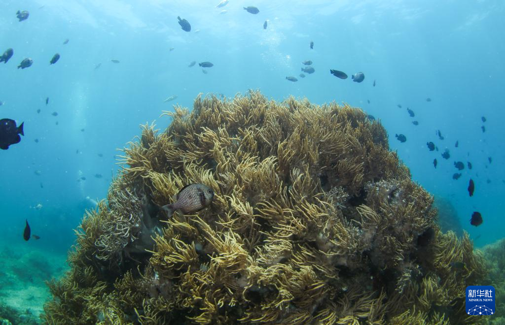 这是在蜈支洲岛海域海洋牧场拍摄的珊瑚和鱼群(2021年5月21日摄)。