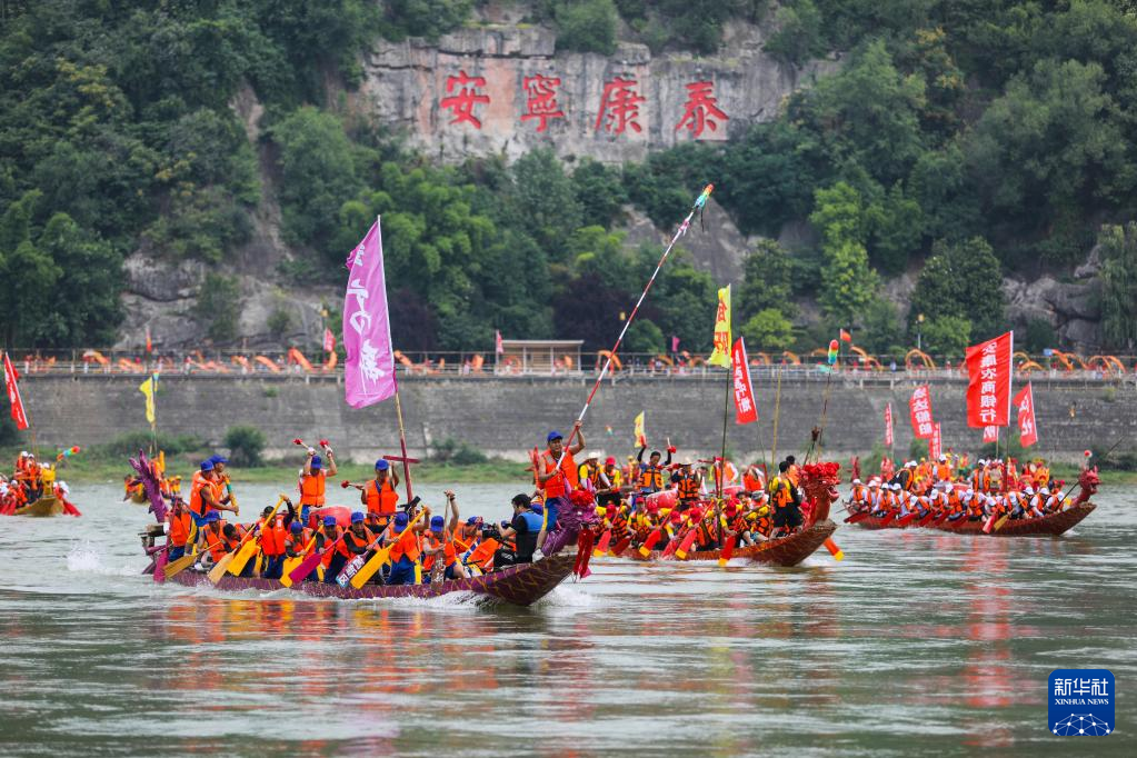 6月22日,第二十三届中国安康汉江龙舟节开幕,28支当地参赛队伍在汉江上表演龙舟竞渡,喜迎端午佳节。