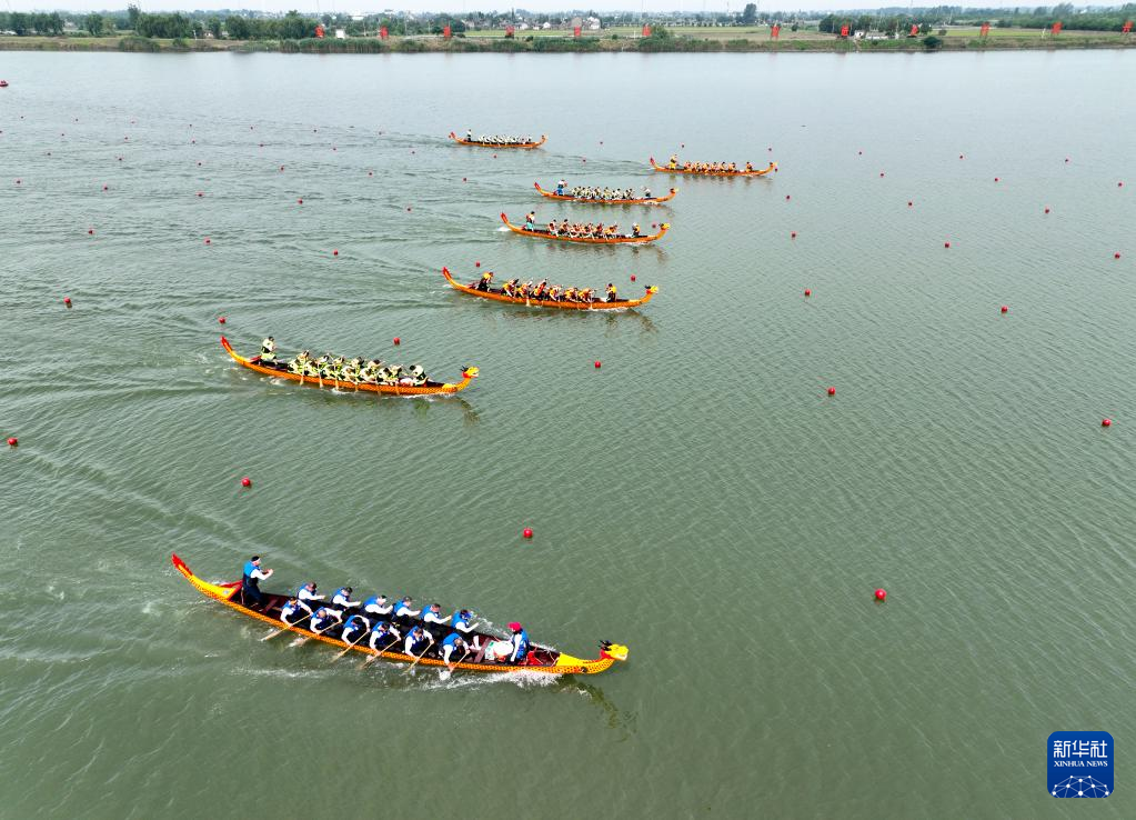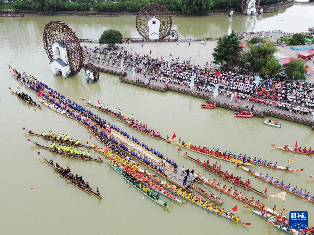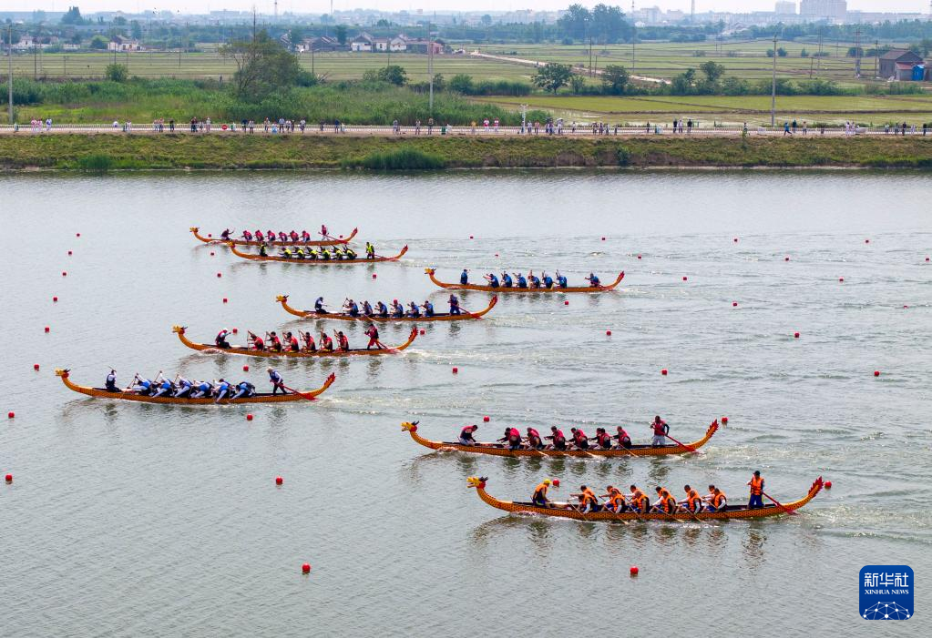 6月23日,在江苏省泰州市水上运动训练基地,人们参加龙舟比赛(无人机照片)。