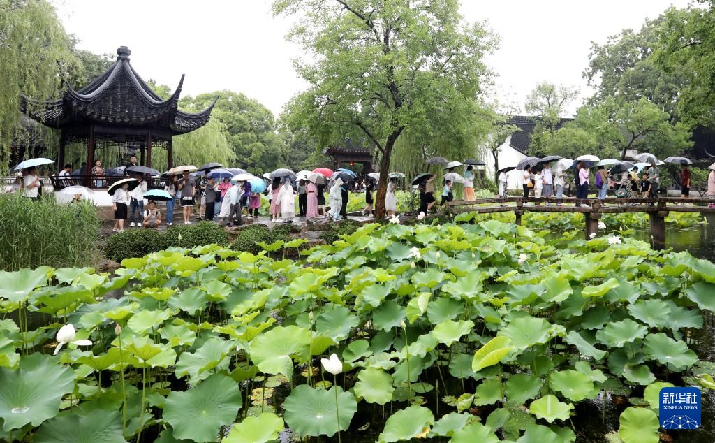 6月24日,在江苏省苏州市,游客在雨中游览拙政园。