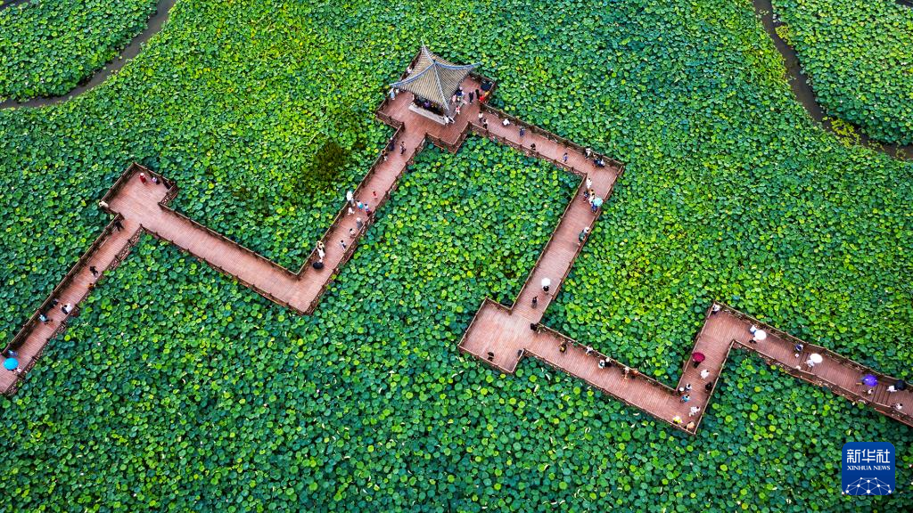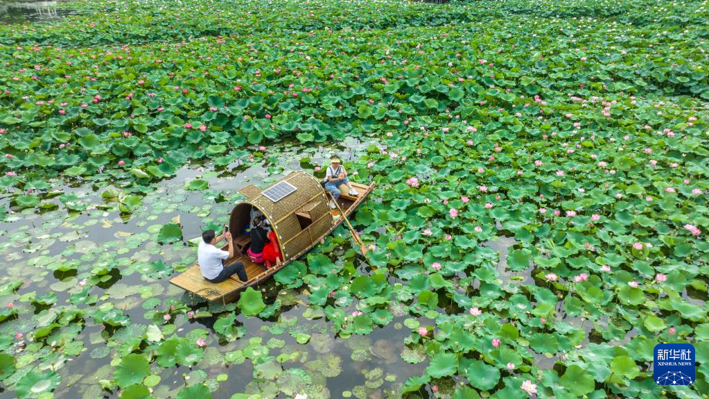 6月24日,游人在广西南宁市南湖公园观赏荷花(无人机照片)。