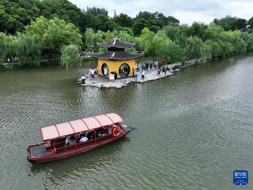 6月24日,游客在江苏省扬州市瘦西湖景区乘船游玩(无人机照片)。
