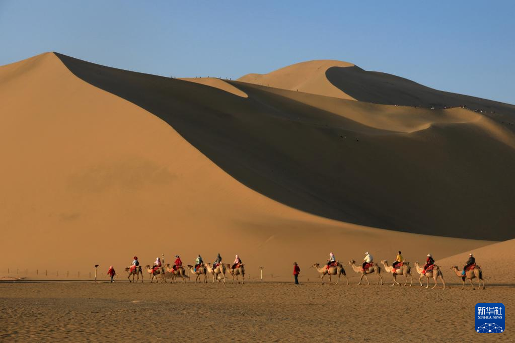 6月24日,游客在甘肃省敦煌市鸣沙山月牙泉景区游览。