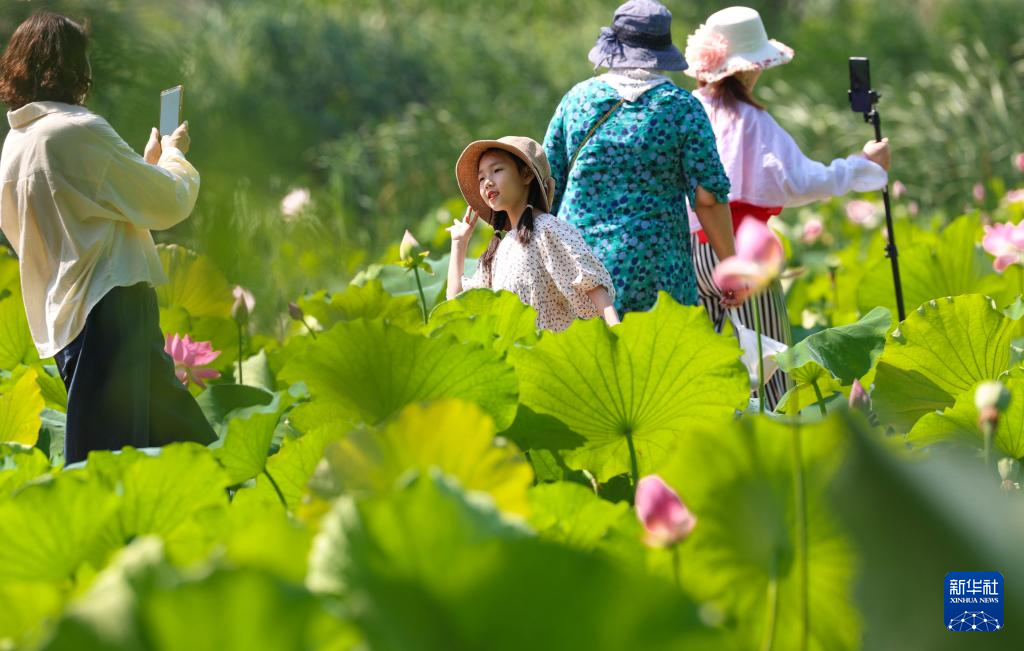 6月24日,游人在湖北省襄阳市月亮湾湿地公园拍照、赏荷。