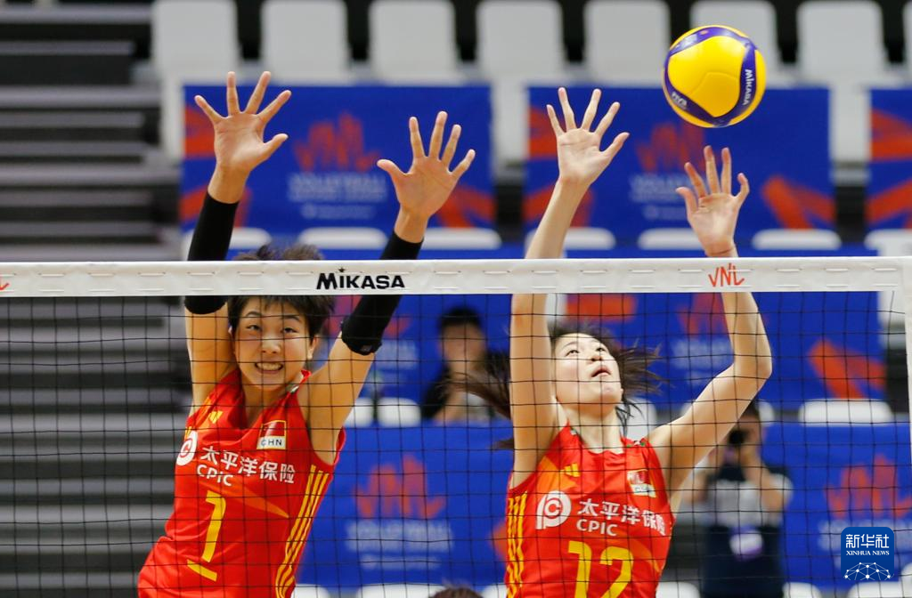 6月28日,中国队球员王云蕗(中前)和杨涵玉(左)在比赛中拦网。