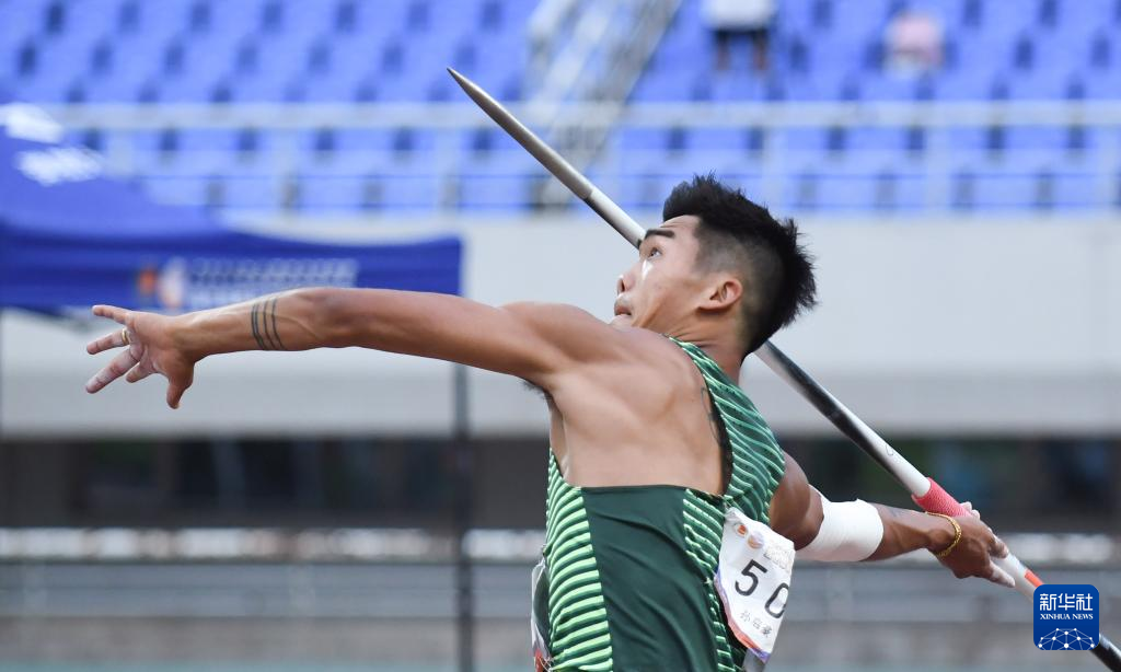6月28日,江苏铁人队选手孙启豪在男子十项全能标枪比赛中。他以58米23的成绩获得标枪项目第一名。