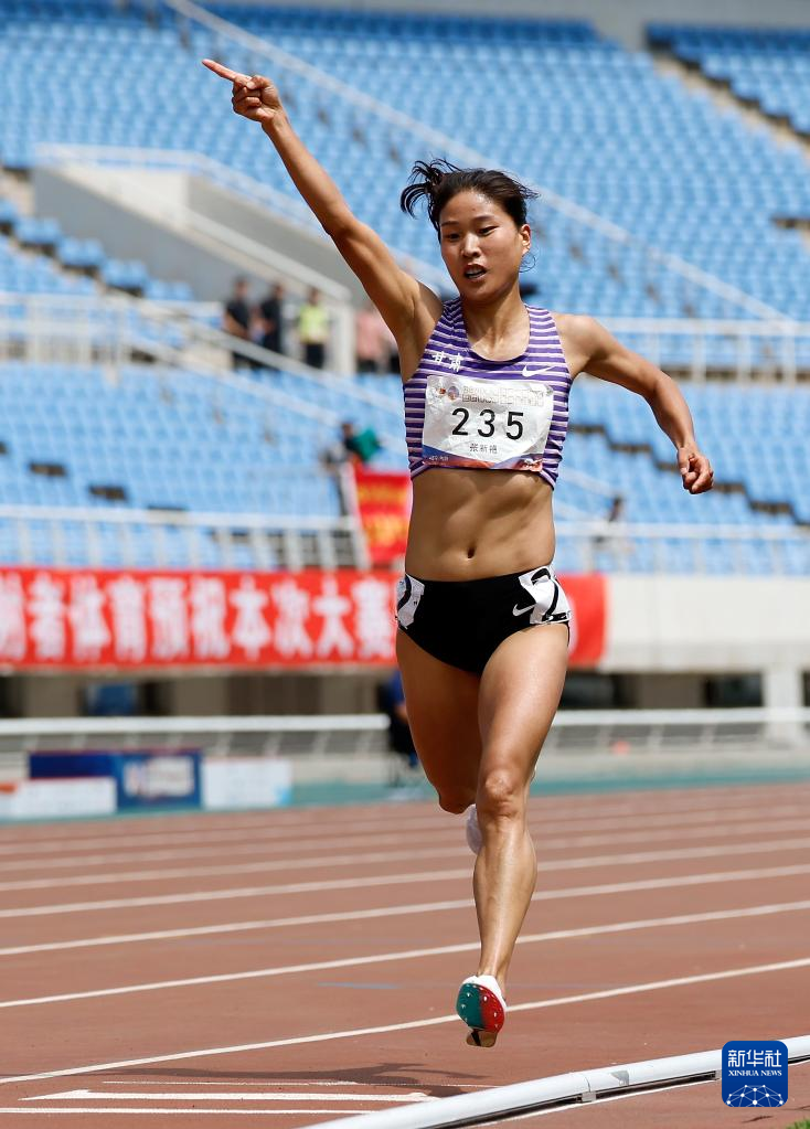6月28日,甘肃队选手张新艳在女子3000米障碍决赛中冲过终点线。最终,张新艳以9分57秒63的成绩夺冠。
