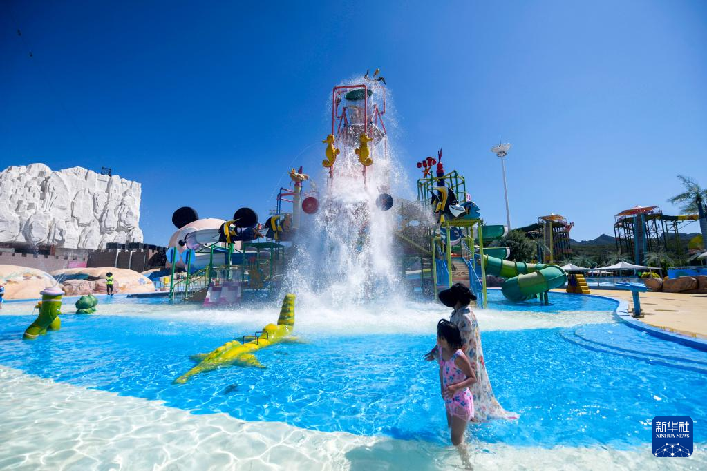 6月29日,游客在河北宽城满族自治县花溪城景区戏水游玩。