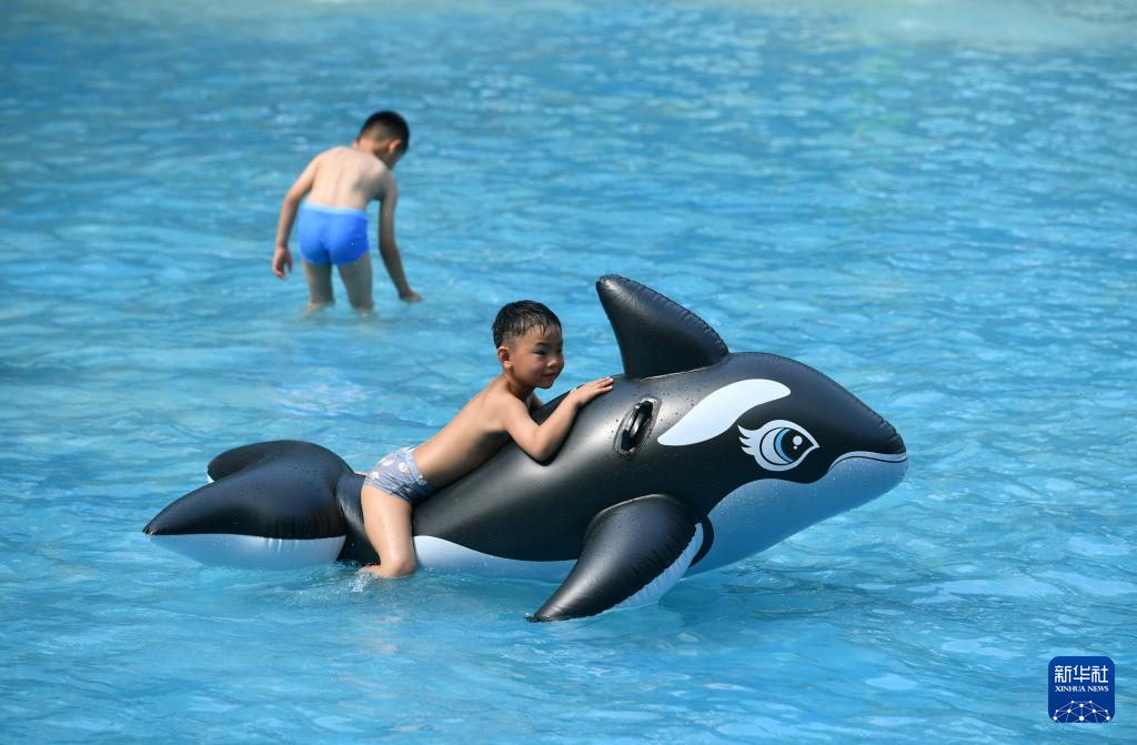 7月1日,小朋友在河南省夏邑县樱花园水上乐园戏水。