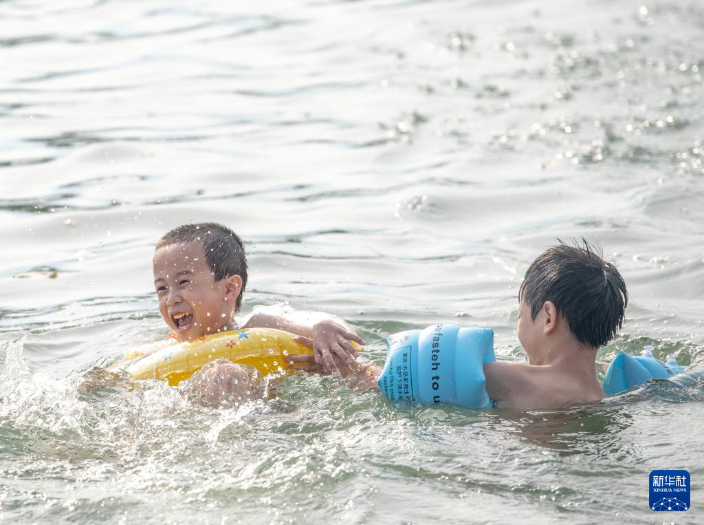 7月1日,在湖南省永州市道县梅花镇贵头村洑水河,小朋友在大人的看护下享受清凉。