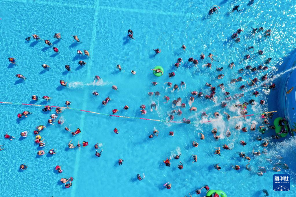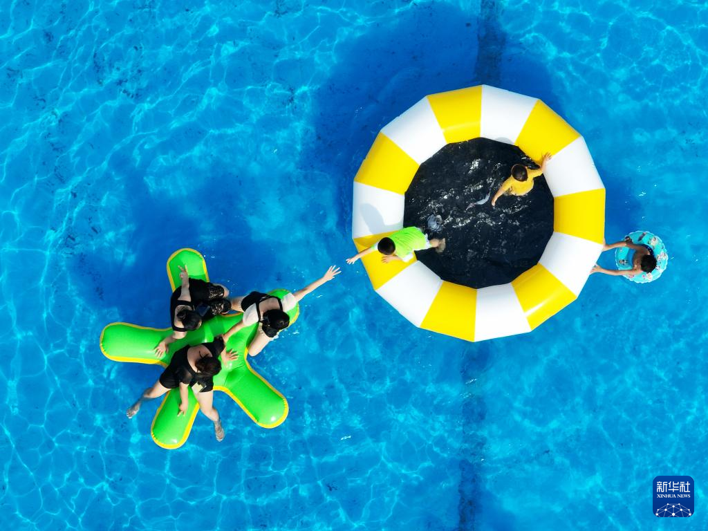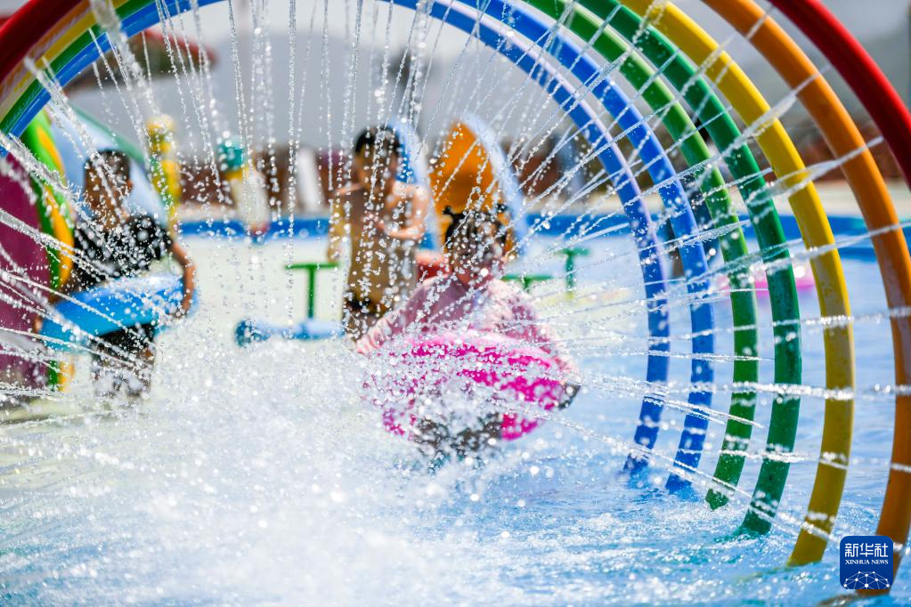 炎炎夏日,人们前往水上乐园,体验趣味水上活动,戏水消暑,享受清凉。