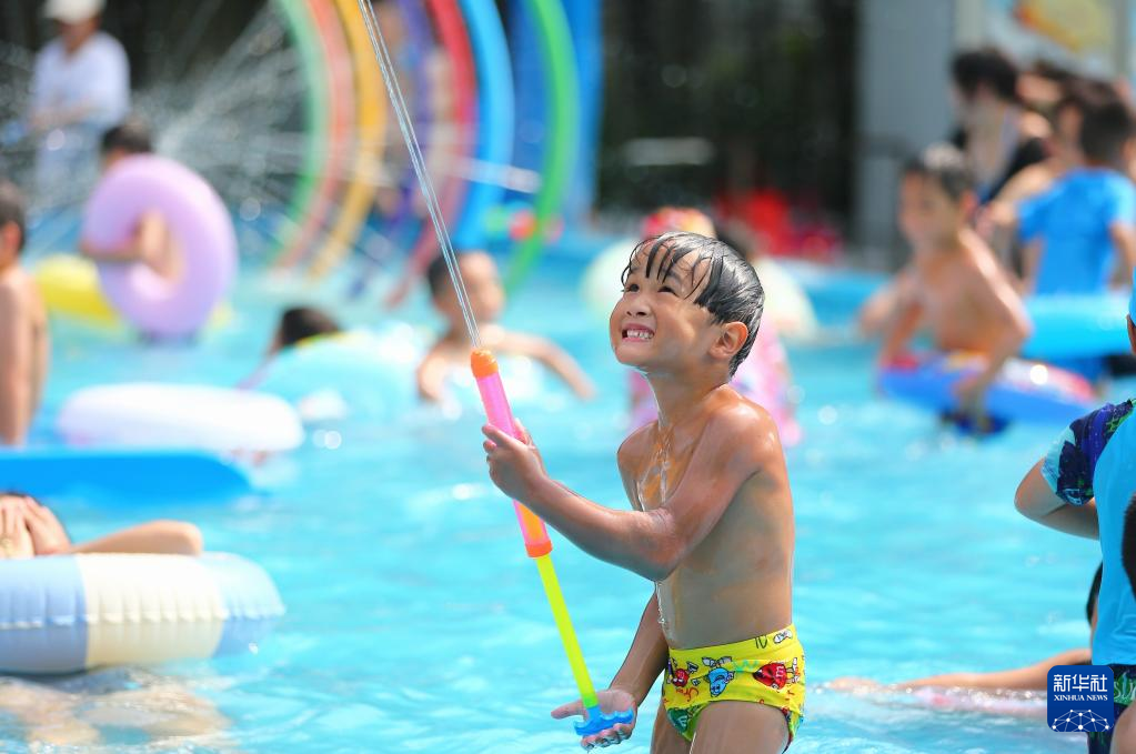 7月1日,小朋友在河北省遵化市娘娘庄镇水上乐园戏水避暑。