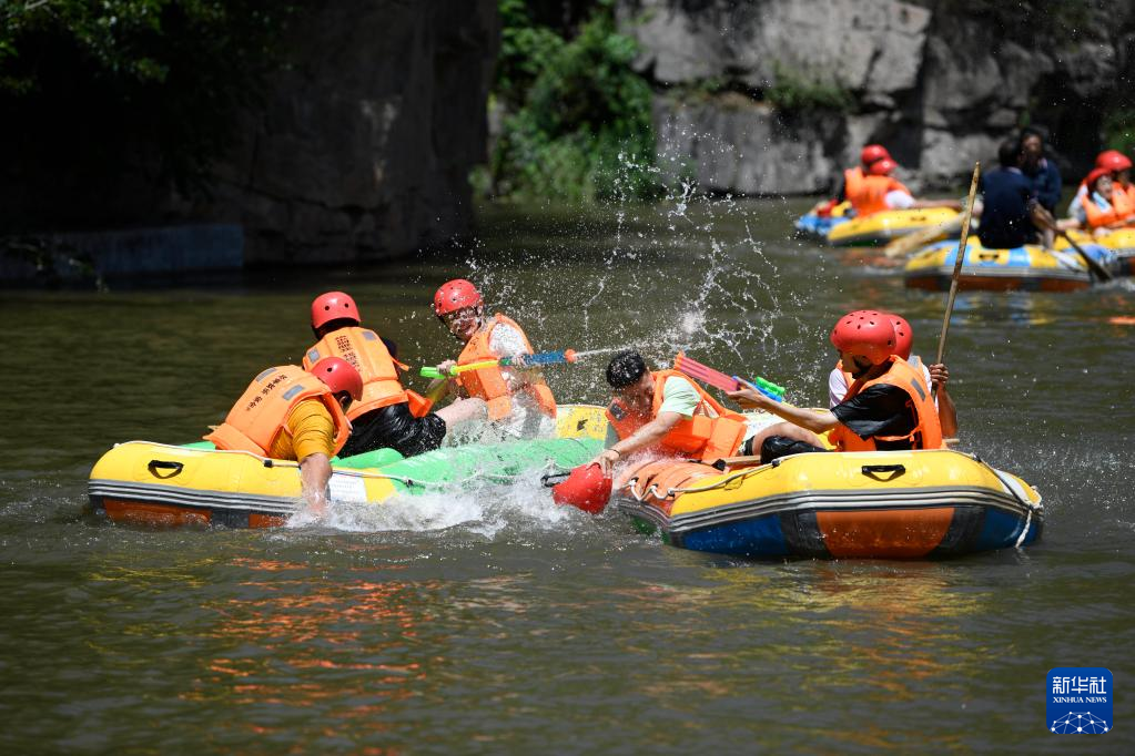 6月29日,游客在河北宽城满族自治县花溪城景区戏水游玩。