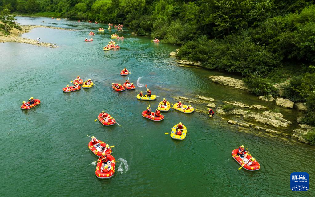 7月1日,人们在贵州省黔南布依族苗族自治州贵定县洛北河体育公园漂流(无人机照片)。