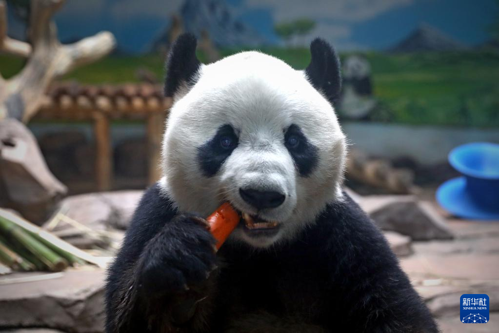 6月26日,“刚刚”在鞍山动物园熊猫馆里吃胡萝卜。