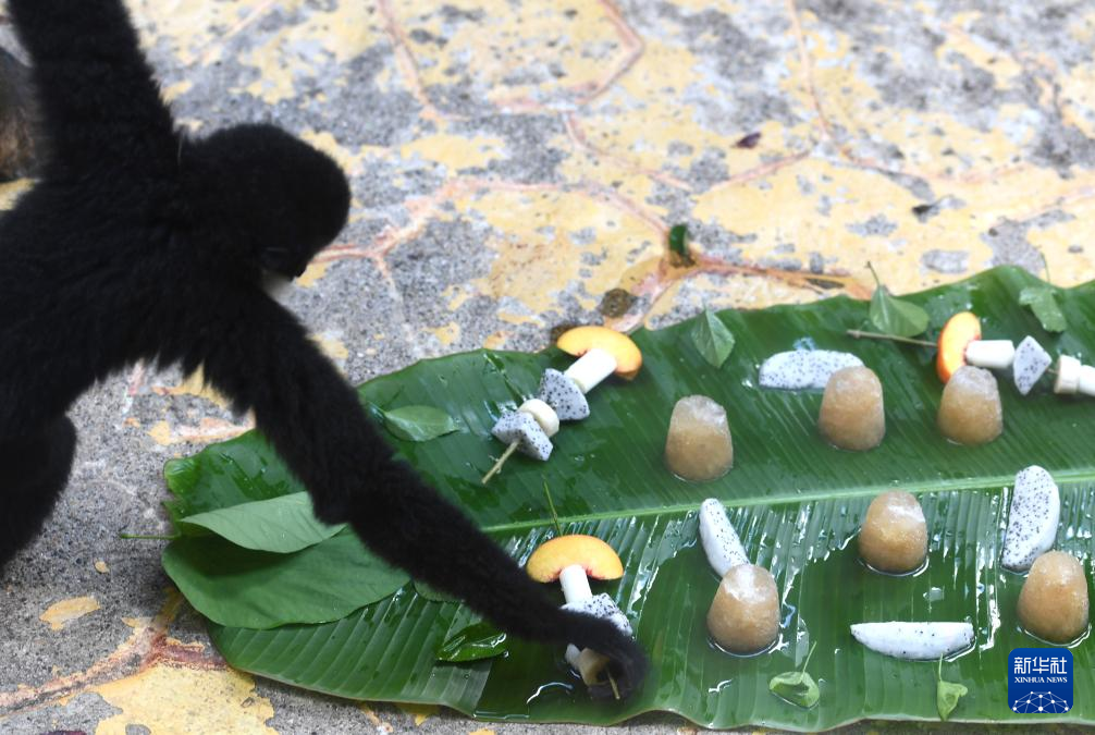7月13日,一只长臂猿在广西南宁市动物园挑选冰镇水果。