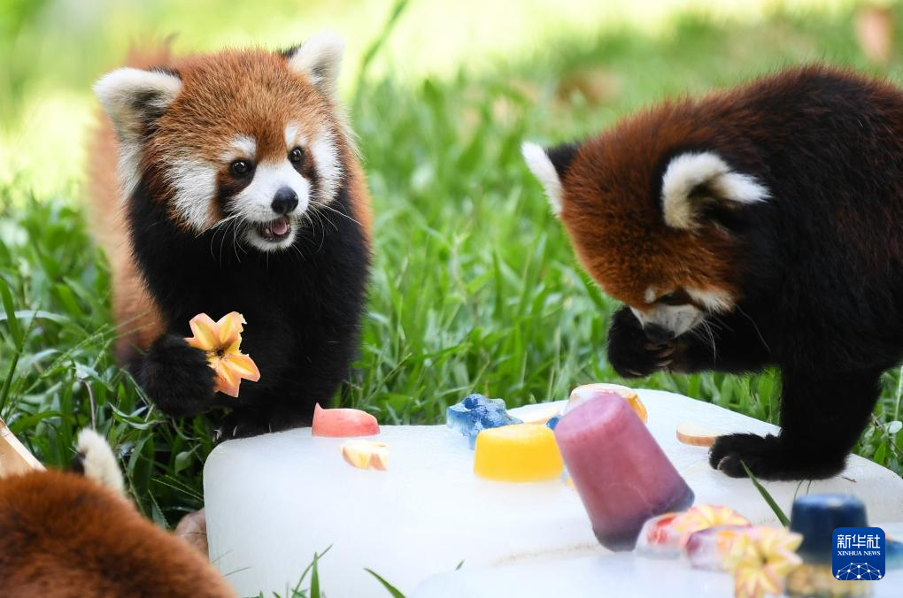7月13日,广州动物园里的小熊猫享用冰镇水果。