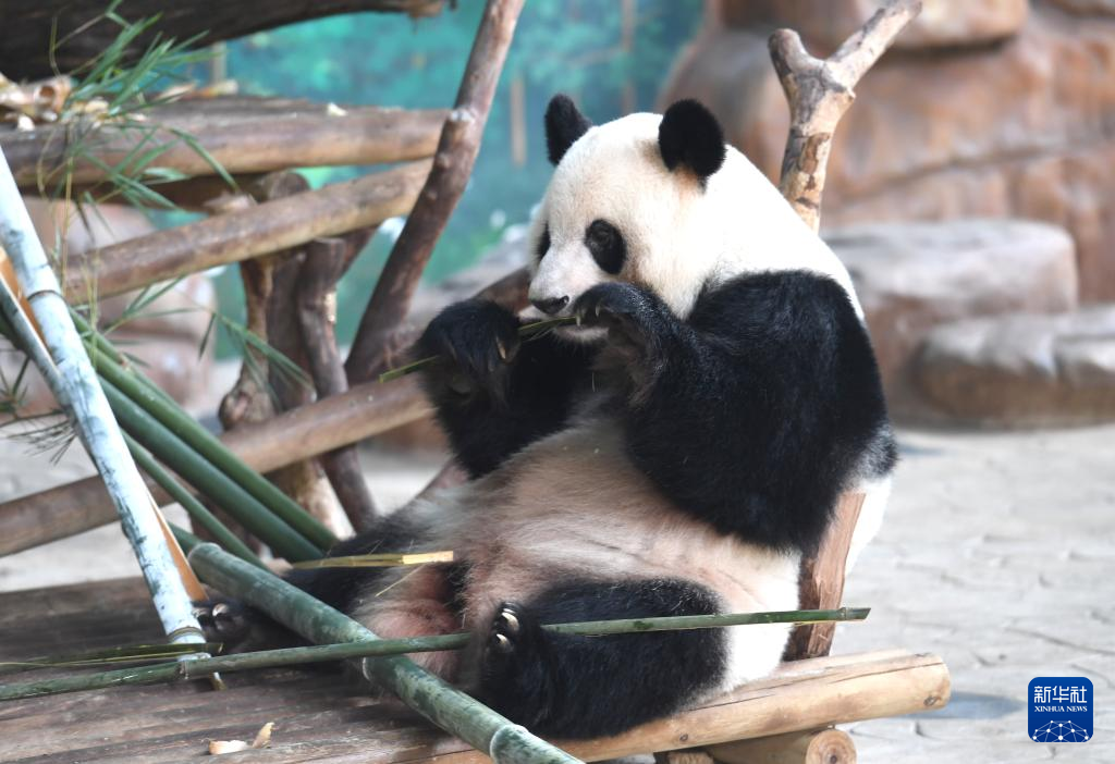 7月13日,一只大熊猫在广西南宁市动物园空调房里享受美食。