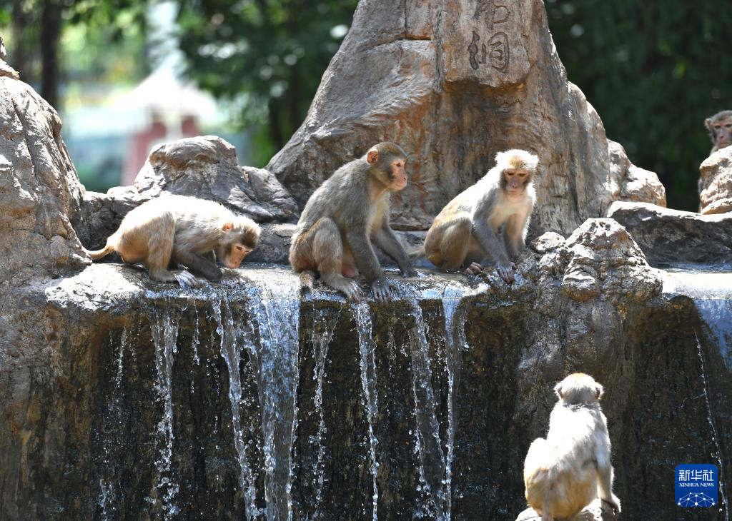 7月13日,几只猕猴在广西南宁市动物园戏水消暑降温。