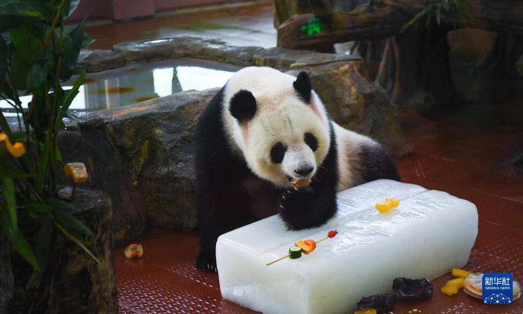7月13日,广州动物园里的熊猫星一享用冰镇水果。