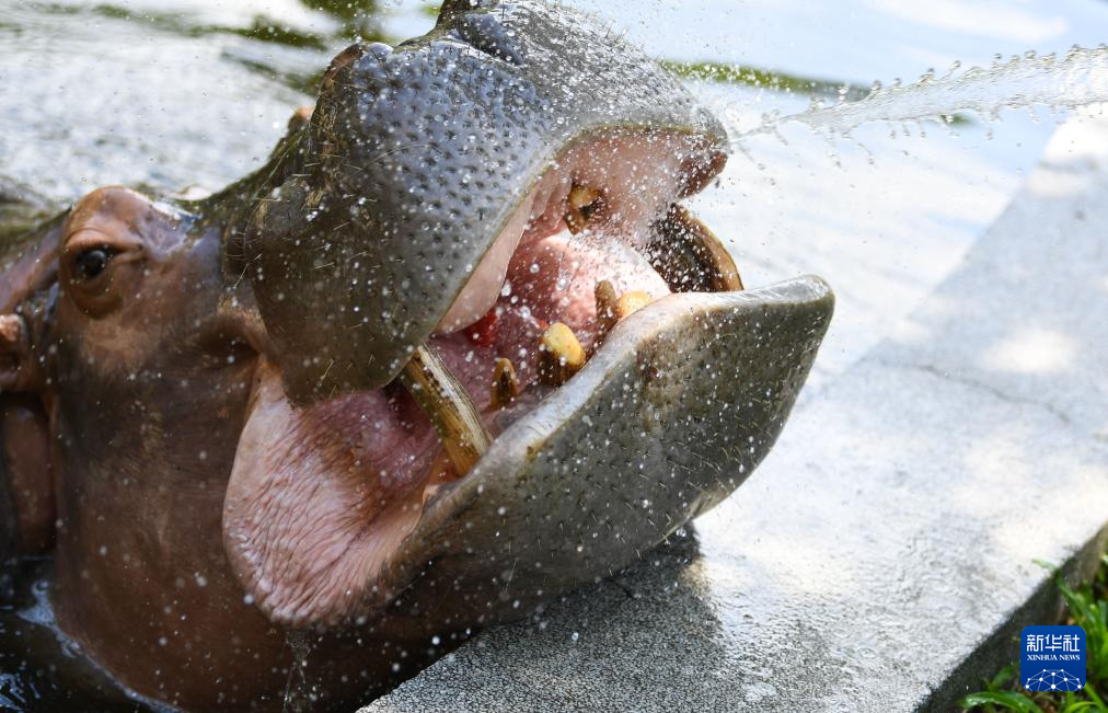 7月13日,广州动物园饲养员给河马喷淋降温。