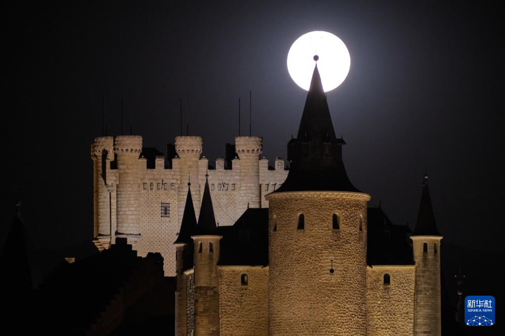 这是8月1日晚在西班牙塞哥维亚拍摄的“超级月亮”和塞哥维亚城堡。