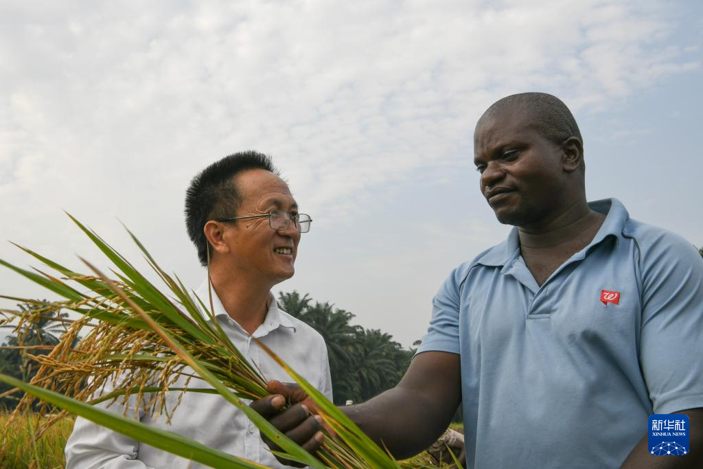 6月20日,在布隆迪布班扎省吉汉加县,中国农业专家组组长杨华德(左)在稻田间和夏尔交流。