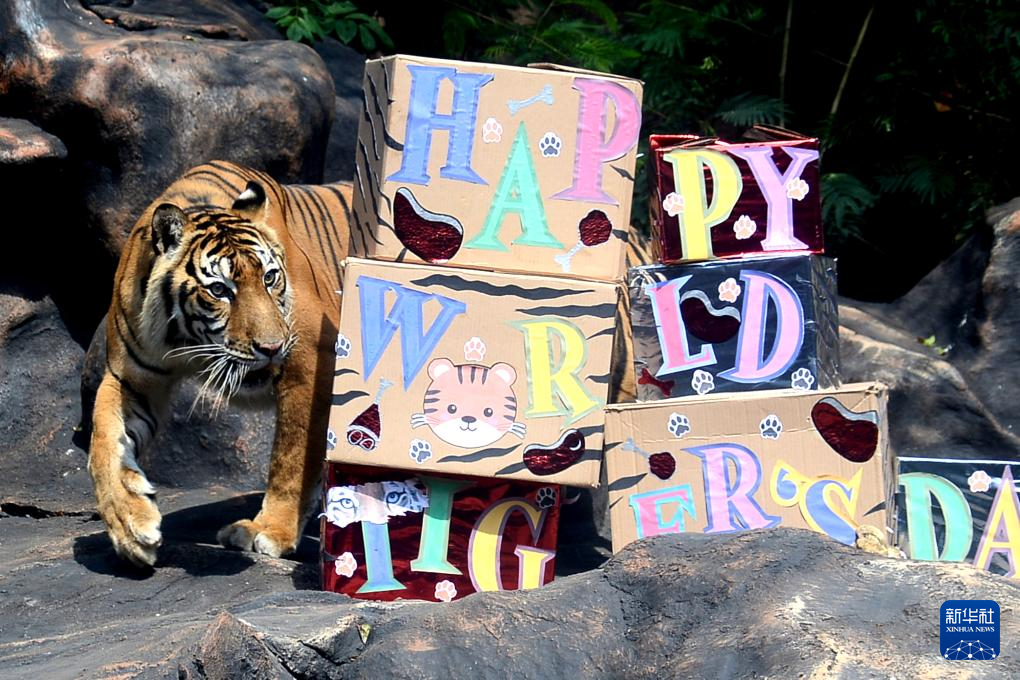 7月29日,在印度尼西亚玛琅的一所动物园,工作人员为苏门答腊虎准备了写有“全球老虎日快乐”字样的“礼物”。