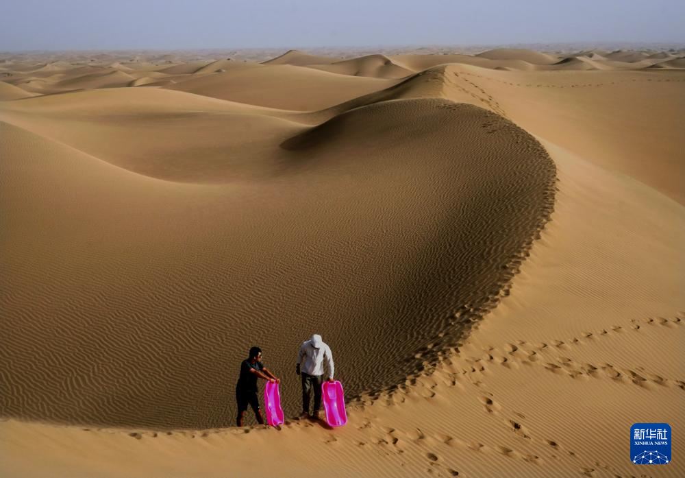 游客在新疆喀什地区麦盖提县N39°沙漠旅游景区内准备体验滑沙(9月7日摄)。