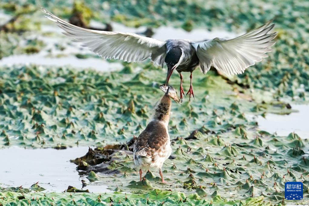 在江苏省盐城市建湖县九龙口国家湿地公园内,须浮鸥衔着小鱼给幼鸟喂食(9月7日摄)。