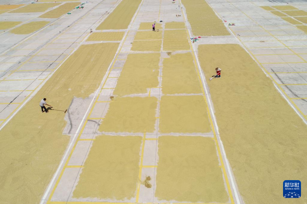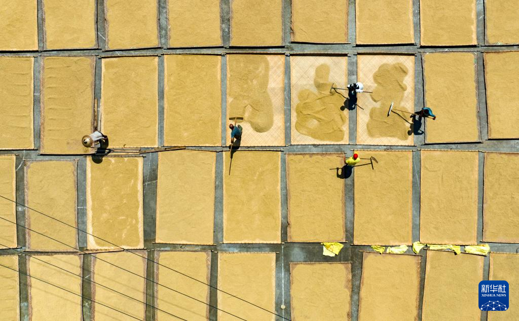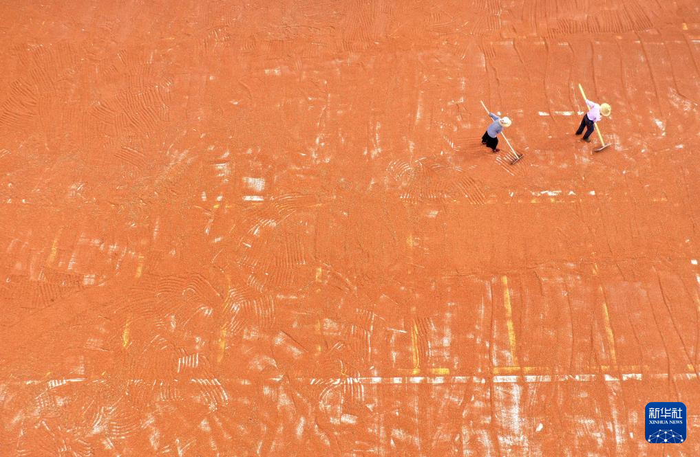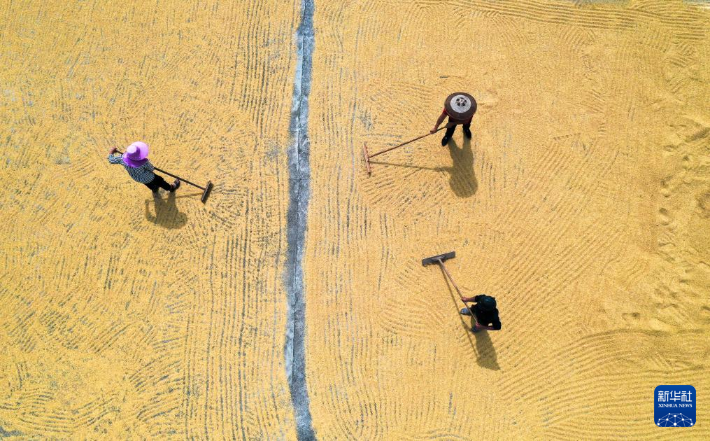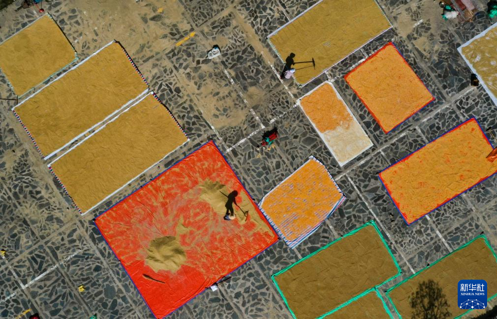 金秋时节,各地农民抓住晴好天气晾晒收获的高粱、水稻、玉米等粮食作物,呈现多彩的丰收图景。