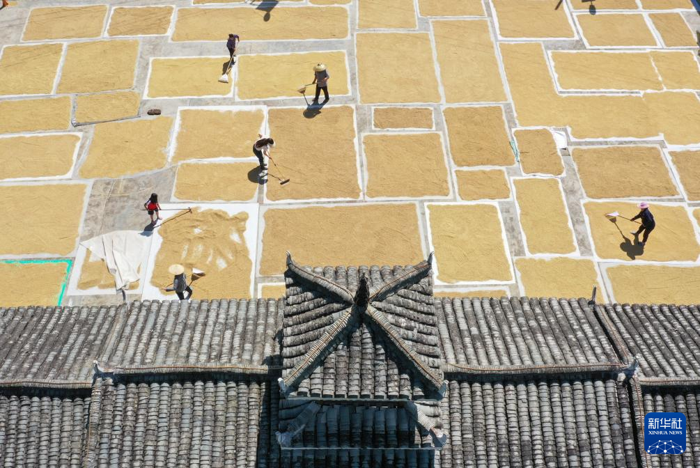 9月16日,村民在贵州省黔东南苗族侗族自治州丹寨县金泉街道晾晒稻谷(无人机照片)。