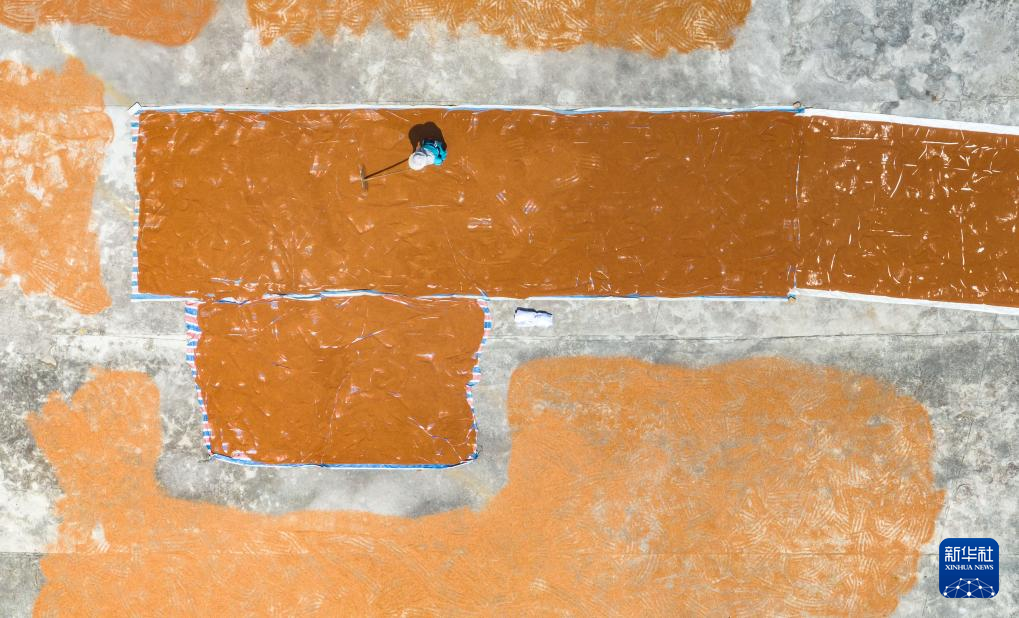 9月16日,湖北省恩施土家族苗族自治州宣恩县珠山镇的农民在晾晒收获的高粱(无人机照片)。