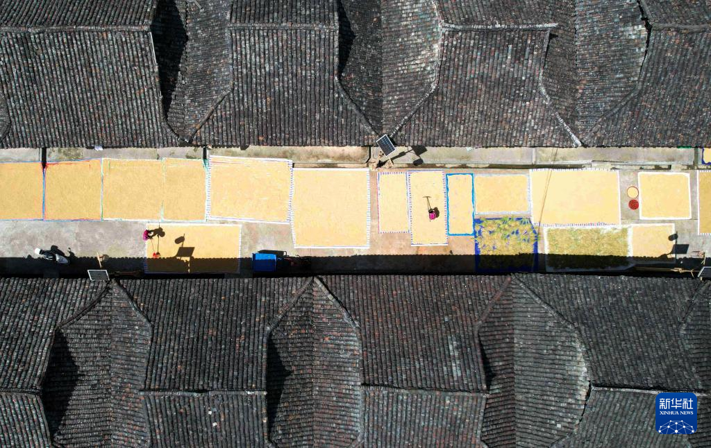 9月16日,在湖南省怀化市通道侗族自治县万佛山镇溪上村,村民在晾晒稻谷(无人机照片)。