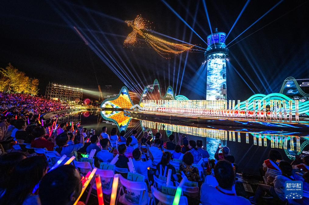 9月16日,第十四届中国长江三峡国际旅游节开幕式在湖北省宜昌市灯塔广场举行,观众在欣赏开幕式表演。