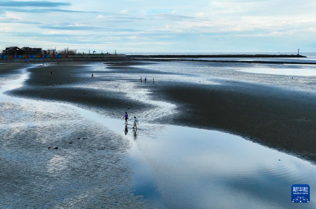 9月16日,游客在江苏省启东市“十里海湾”滩涂上游玩(无人机照片)。