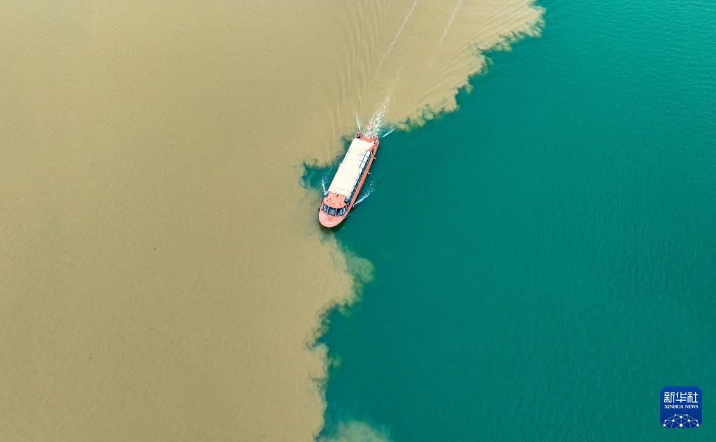 9月20日,受降雨影响,汉江湖北襄阳城区段呈现出“泾渭分明”的景观(无人机照片)。