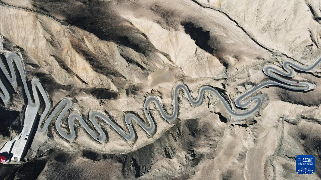 9月5日,游客驾车穿行在新疆塔什库尔干塔吉克自治县“盘龙古道”景区(无人机照片)。