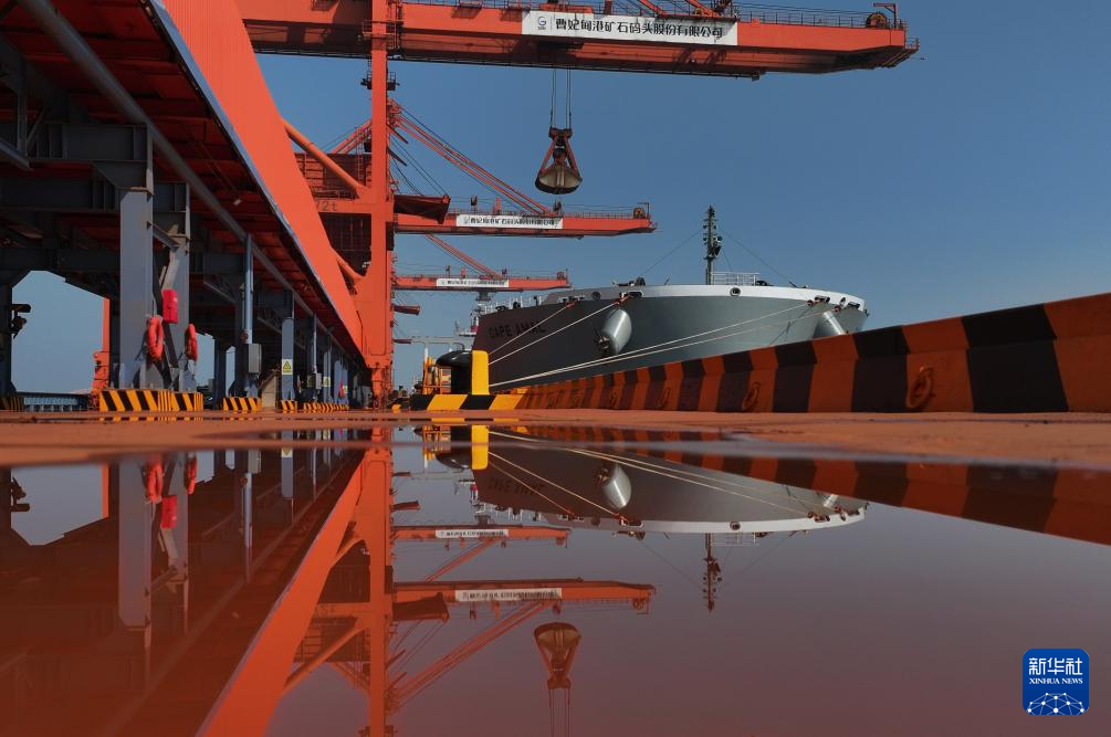 9月16日,一艘轮船靠泊在唐山港曹妃甸港区矿石码头卸载(无人机照片)。