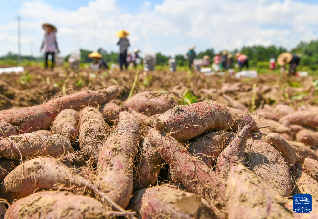 9月18日,在湖南省永州市道县富塘街道大福社区,村民在收获红薯。