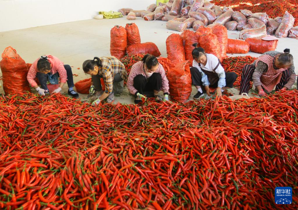 9月17日,在云南省曲靖市沾益区金龙街道新海社区的辣椒收购点,务工人员分拣辣椒。