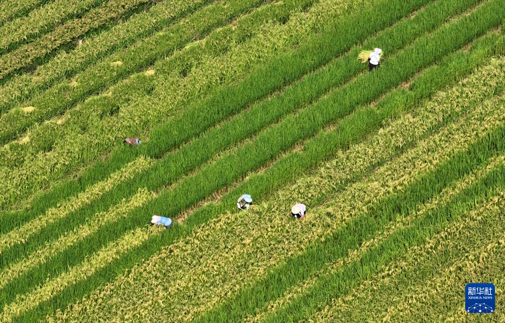 9月17日,村民在贵州省从江县加榜乡梯田里抢收水稻。