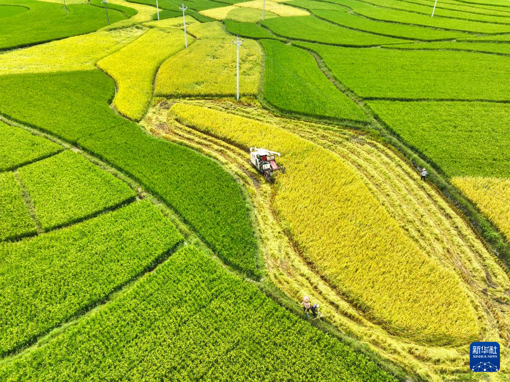 9月16日,湖南省郴州市桂阳县流峰镇农民驾驶收割机在收割水稻(无人机照片)。