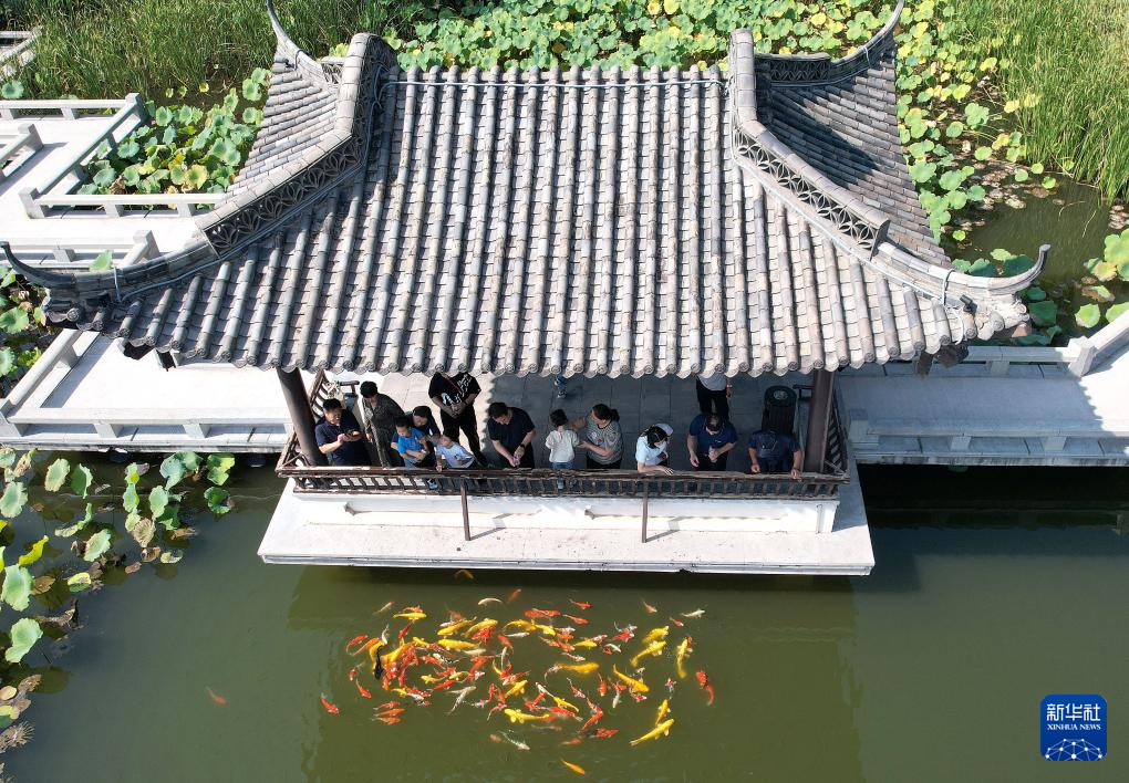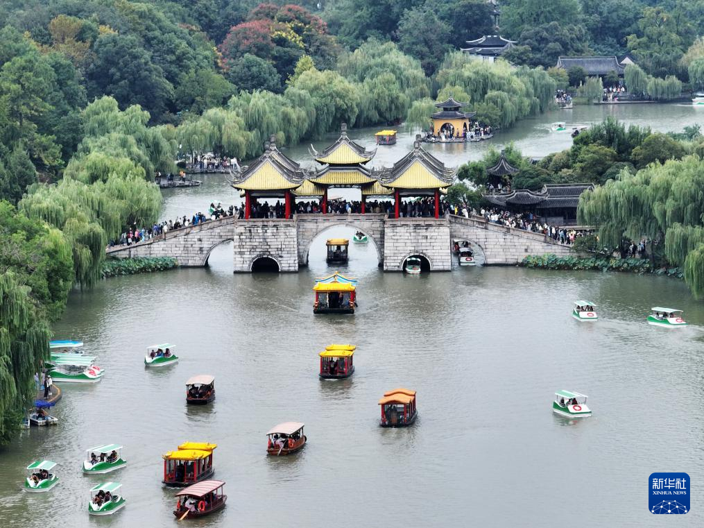10月3日,游客在江苏扬州瘦西湖风景区游玩(无人机照片)。
