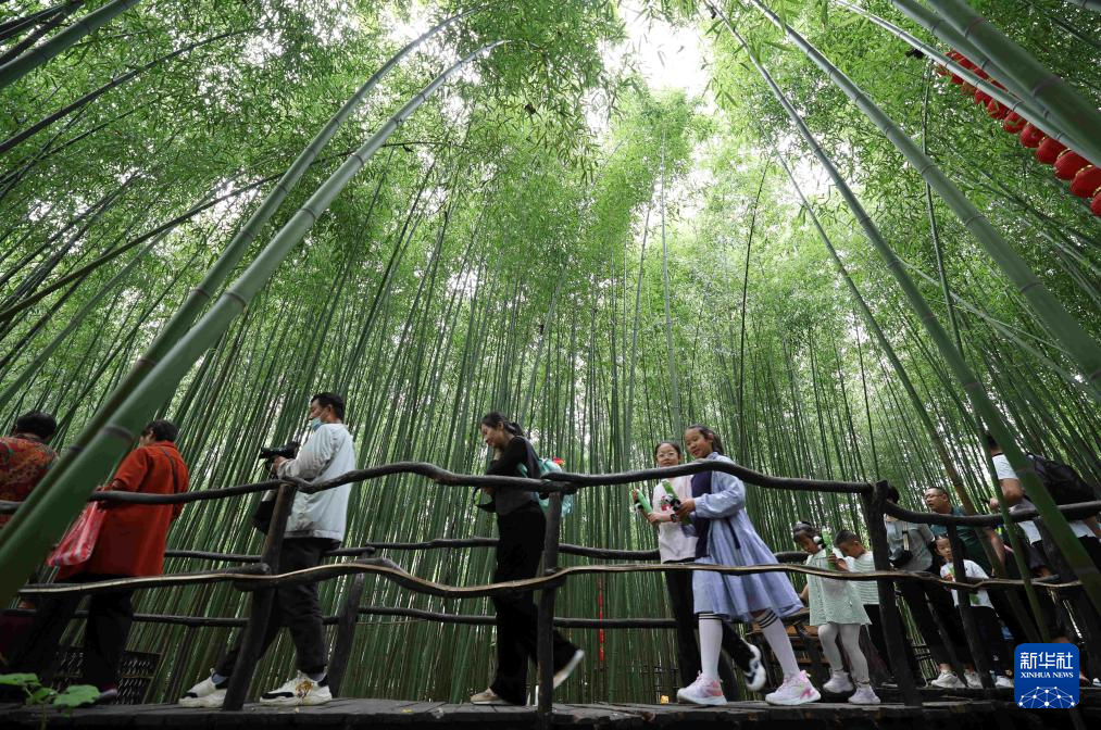 10月3日,在山东省临沂市沂南县铜井镇竹泉村,游客在竹林栈道游玩。